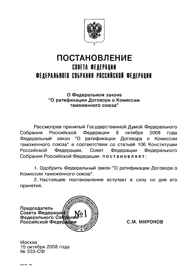 ПОСТАНОВЛЕНИЕ СФ ФС РФ от 15.10.2008 N 333-СФ