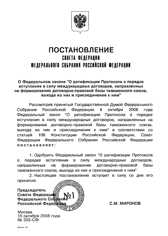 ПОСТАНОВЛЕНИЕ СФ ФС РФ от 15.10.2008 N 335-СФ