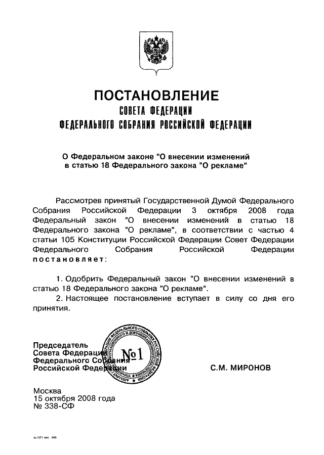 ПОСТАНОВЛЕНИЕ СФ ФС РФ от 15.10.2008 N 338-СФ