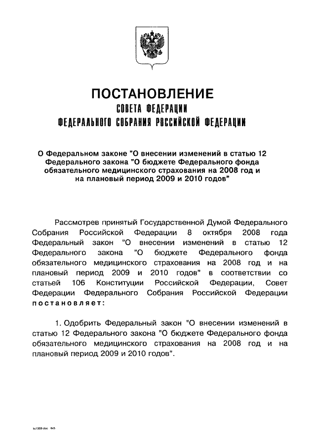"О ФЕДЕРАЛЬНОМ ЗАКОНЕ "О ВНЕСЕНИИ ИЗМЕНЕНИЙ В СТАТЬЮ 12 ФЕДЕРАЛЬНОГО ЗАКОНА "О БЮДЖЕТЕ ФЕДЕРАЛЬНОГО ФОНДА ОБЯЗАТЕЛЬНОГО МЕДИЦИНСКОГО СТРАХОВАНИЯ НА 2008 ГОД И НА ПЛАНОВЫЙ ПЕРИОД 2009 И 2010 ГОДОВ"