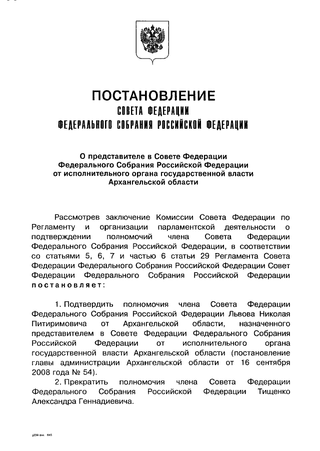 "О ПРЕДСТАВИТЕЛЕ В СОВЕТЕ ФЕДЕРАЦИИ ФЕДЕРАЛЬНОГО СОБРАНИЯ РОССИЙСКОЙ ФЕДЕРАЦИИ ОТ ИСПОЛНИТЕЛЬНОГО ОРГАНА ГОСУДАРСТВЕННОЙ ВЛАСТИ АРХАНГЕЛЬСКОЙ ОБЛАСТИ"