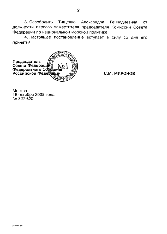 ПОСТАНОВЛЕНИЕ СФ ФС РФ от 15.10.2008 N 327-СФ