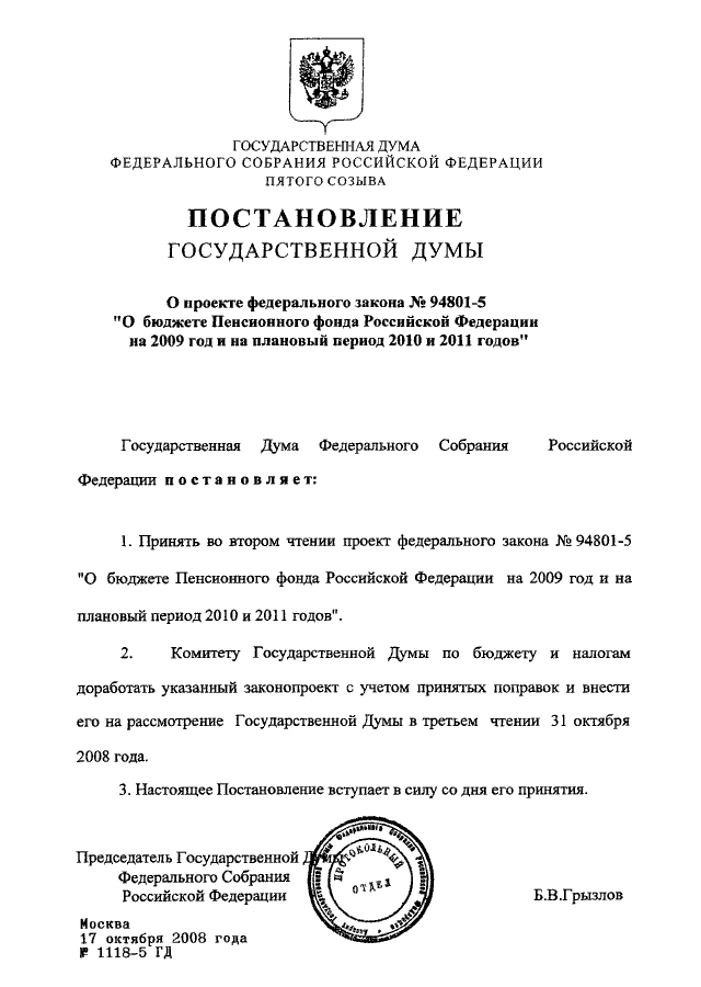 ПОСТАНОВЛЕНИЕ ГД ФС РФ от 17.10.2008 N 1118-5 ГД