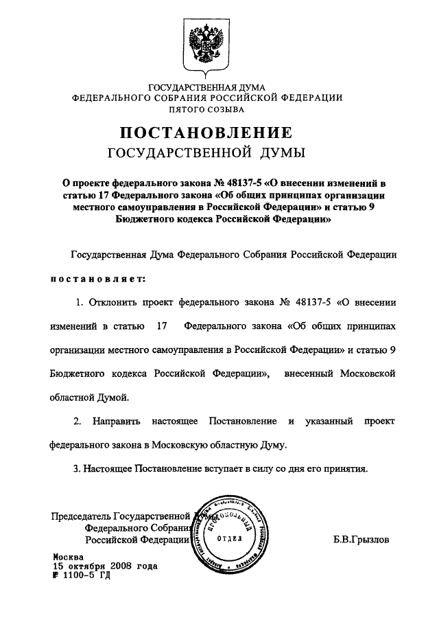 ПОСТАНОВЛЕНИЕ ГД ФС РФ от 15.10.2008 N 1100-5 ГД
