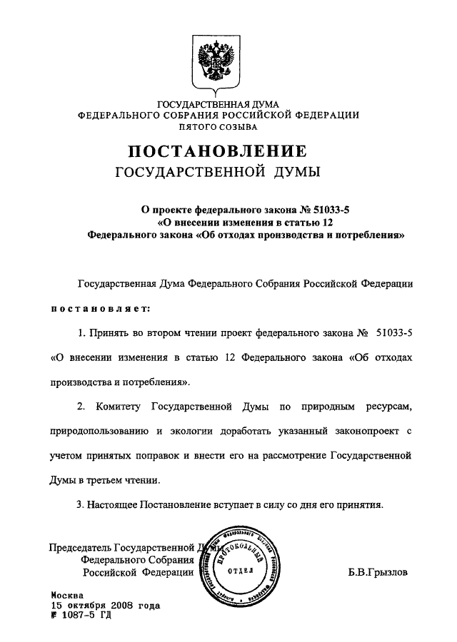ПОСТАНОВЛЕНИЕ ГД ФС РФ от 15.10.2008 N 1087-5 ГД