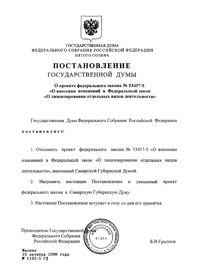 ПОСТАНОВЛЕНИЕ ГД ФС РФ от 15.10.2008 N 1102-5 ГД