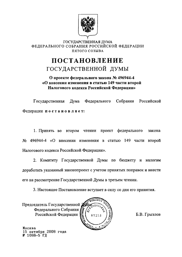ПОСТАНОВЛЕНИЕ ГД ФС РФ от 15.10.2008 N 1088-5 ГД