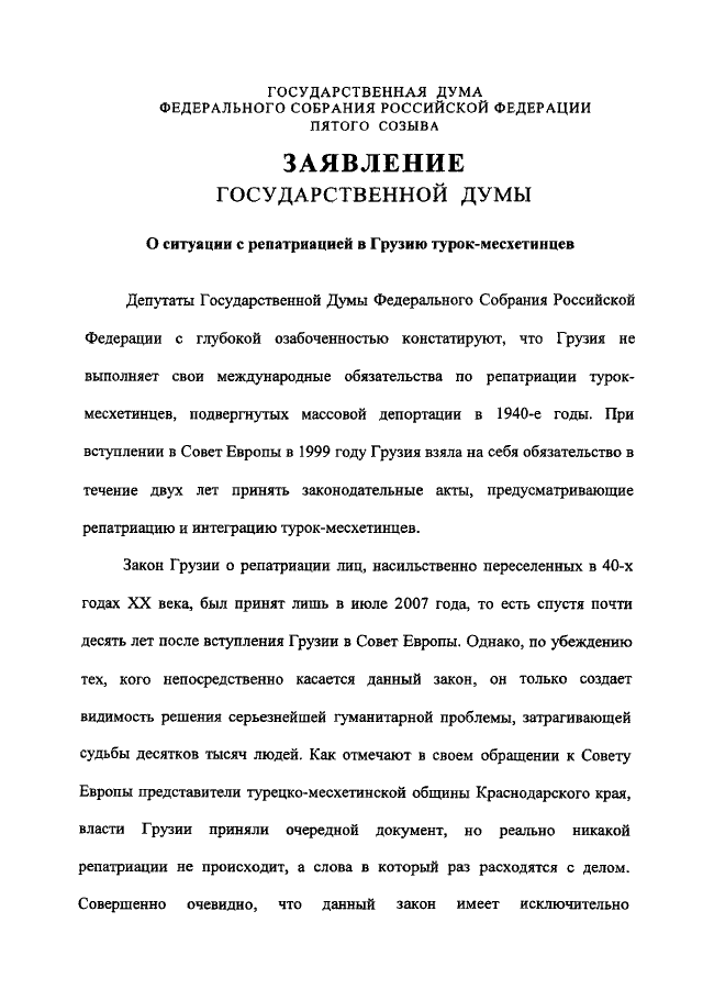 "О ЗАЯВЛЕНИИ ГОСУДАРСТВЕННОЙ ДУМЫ ФЕДЕРАЛЬНОГО СОБРАНИЯ РОССИЙСКОЙ ФЕДЕРАЦИИ "О СИТУАЦИИ С РЕПАТРИАЦИЕЙ В ГРУЗИЮ ТУРОК - МЕСХЕТИНЦЕВ"