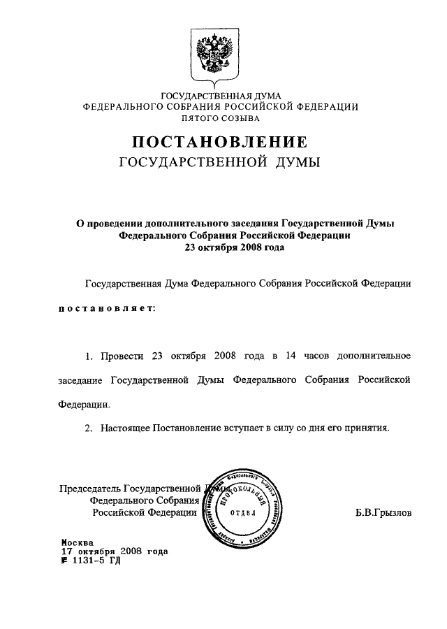 ПОСТАНОВЛЕНИЕ ГД ФС РФ от 17.10.2008 N 1131-5 ГД