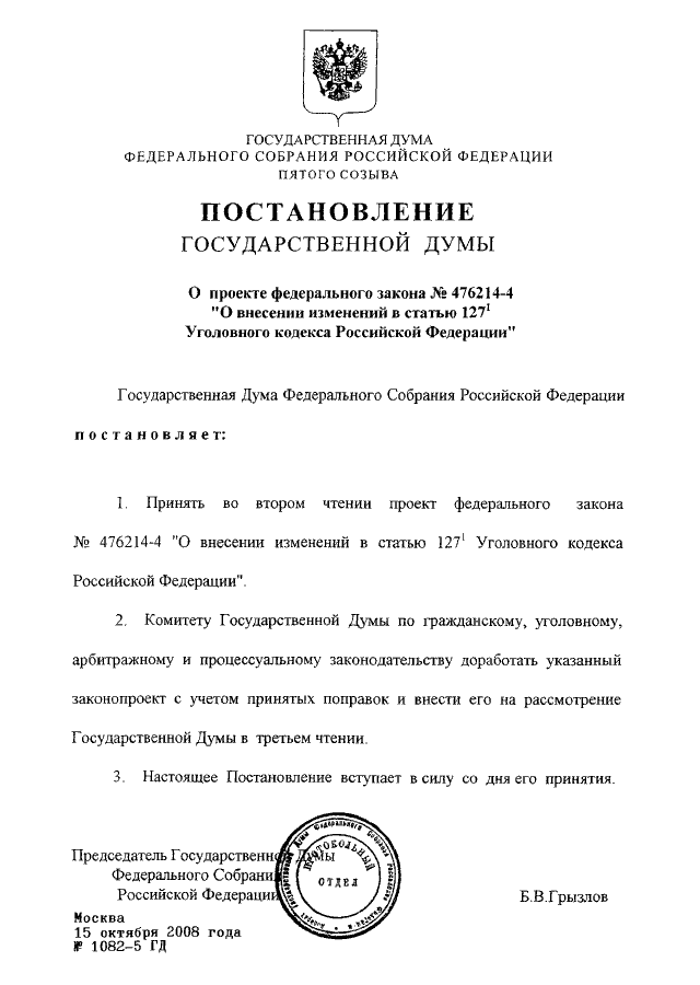 ПОСТАНОВЛЕНИЕ ГД ФС РФ от 15.10.2008 N 1082-5 ГД