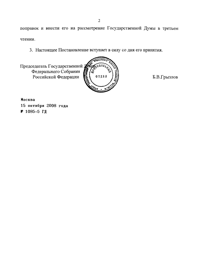 ПОСТАНОВЛЕНИЕ ГД ФС РФ от 15.10.2008 N 1085-5 ГД