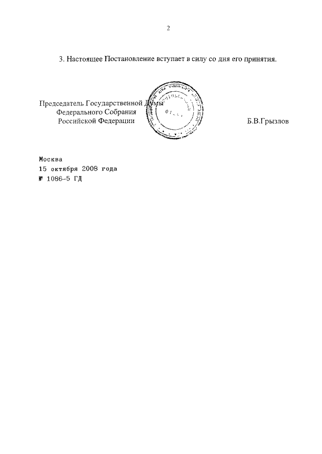ПОСТАНОВЛЕНИЕ ГД ФС РФ от 15.10.2008 N 1086-5 ГД