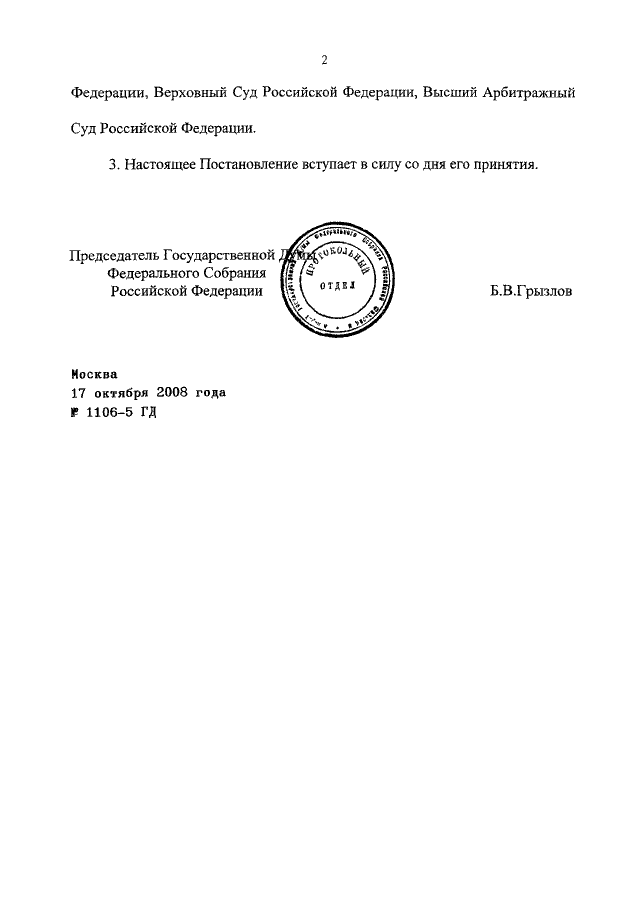ПОСТАНОВЛЕНИЕ ГД ФС РФ от 17.10.2008 N 1106-5 ГД