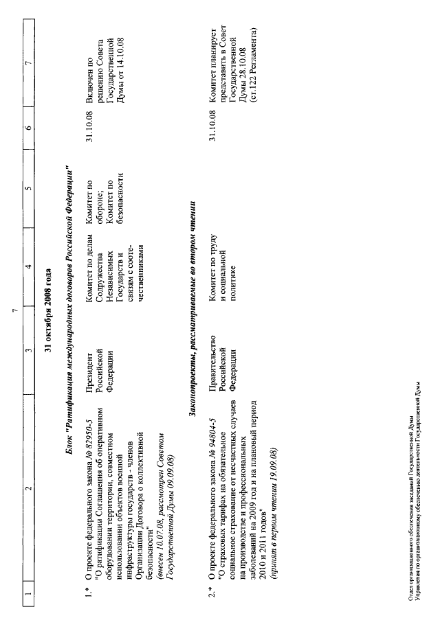"О КАЛЕНДАРЕ РАССМОТРЕНИЯ ВОПРОСОВ ГОСУДАРСТВЕННОЙ ДУМОЙ С 29 ОКТЯБРЯ ПО 21 НОЯБРЯ 2008 ГОДА"