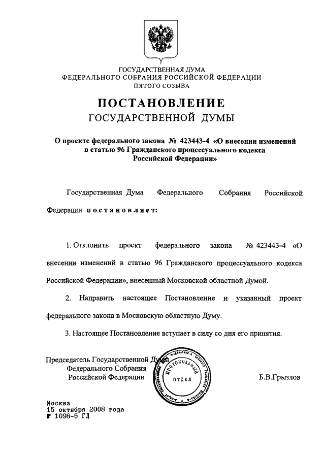 ПОСТАНОВЛЕНИЕ ГД ФС РФ от 15.10.2008 N 1098-5 ГД