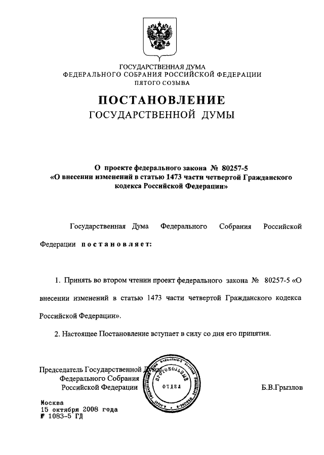 ПОСТАНОВЛЕНИЕ ГД ФС РФ от 15.10.2008 N 1083-5 ГД