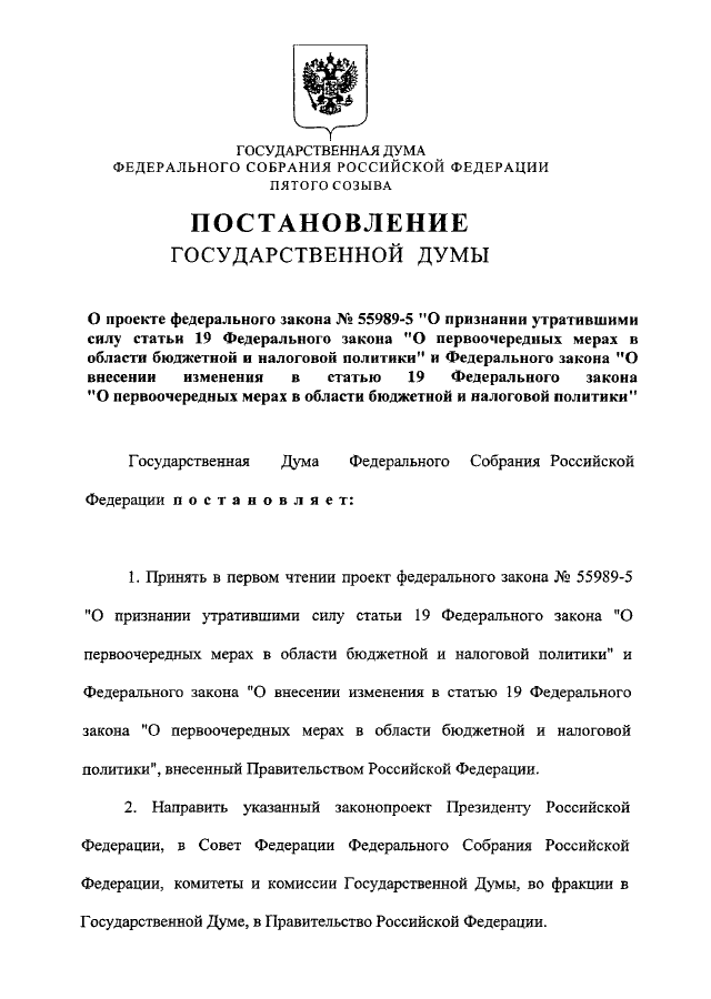 ПЕРВООЧЕРЕДНЫХ МЕРАХ В ОБЛАСТИ БЮДЖЕТНОЙ И НАЛОГОВОЙ ПОЛИТИКИ"