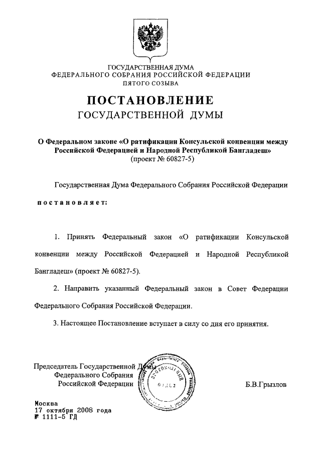 "О ФЕДЕРАЛЬНОМ ЗАКОНЕ "О РАТИФИКАЦИИ КОНСУЛЬСКОЙ КОНВЕНЦИИ МЕЖДУ РОССИЙСКОЙ ФЕДЕРАЦИЕЙ И НАРОДНОЙ РЕСПУБЛИКОЙ БАНГЛАДЕШ" (ПРОЕКТ N 60827-5)"