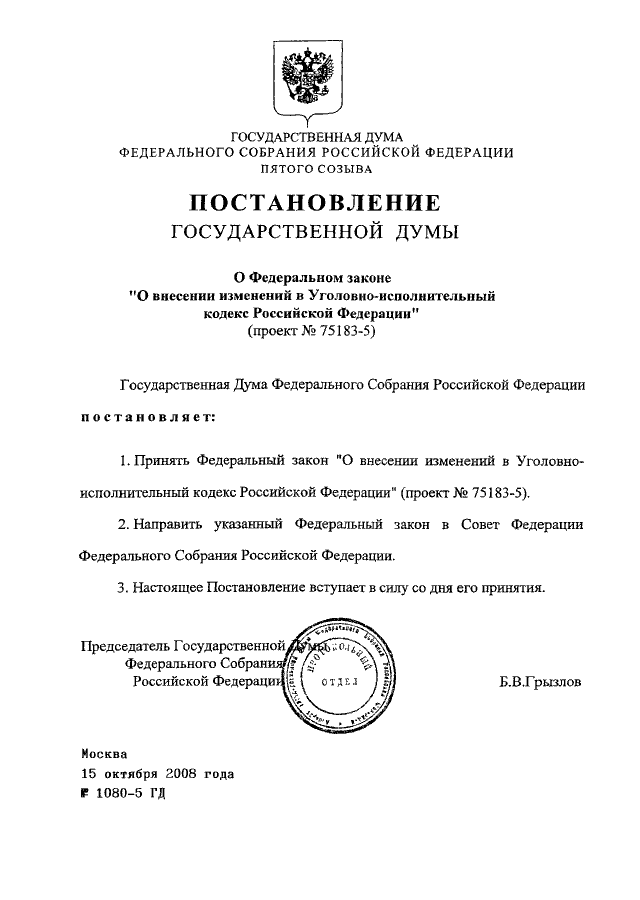 ПОСТАНОВЛЕНИЕ ГД ФС РФ от 15.10.2008 N 1080-5 ГД
