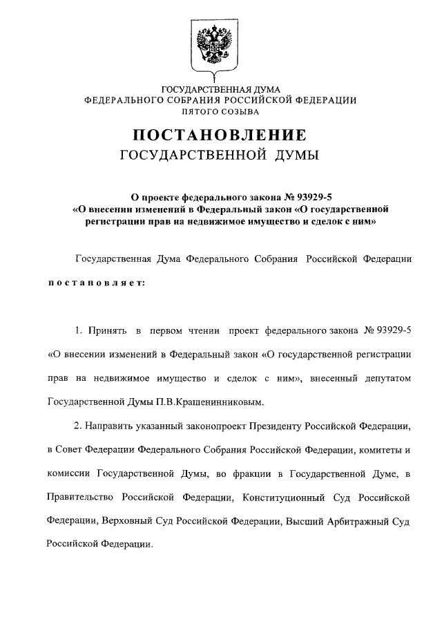 "О ПРОЕКТЕ ФЕДЕРАЛЬНОГО ЗАКОНА N 93929-5 "О ВНЕСЕНИИ ИЗМЕНЕНИЙ В ФЕДЕРАЛЬНЫЙ ЗАКОН"О ГОСУДАРСТВЕННОЙ РЕГИСТРАЦИИ ПРАВ НА НЕДВИЖИМОЕ ИМУЩЕСТВО И СДЕЛОК С НИМ"