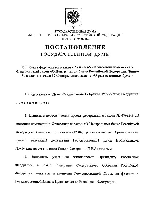 "О ПРОЕКТЕ ФЕДЕРАЛЬНОГО ЗАКОНА N 47683-5 "О ВНЕСЕНИИ ИЗМЕНЕНИЙ В ФЕДЕРАЛЬНЫЙ ЗАКОН "О ЦЕНТРАЛЬНОМ БАНКЕ РОССИЙСКОЙ ФЕДЕРАЦИИ (БАНКЕ РОССИИ)" И СТАТЬЮ 12 ФЕДЕРАЛЬНОГО ЗАКОНА "О РЫНКЕ ЦЕННЫХ БУМАГ"