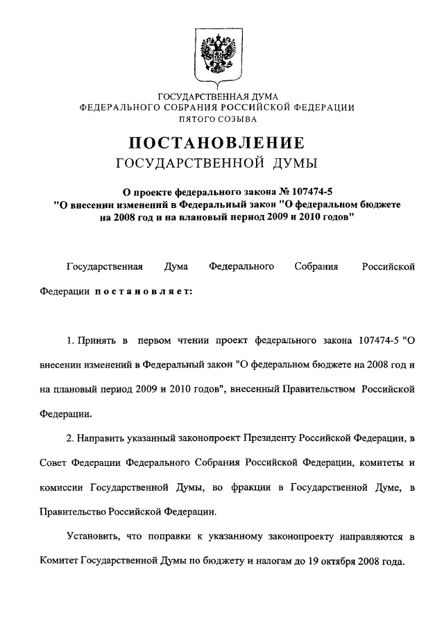 "О ПРОЕКТЕ ФЕДЕРАЛЬНОГО ЗАКОНА N 107474-5 "О ВНЕСЕНИИ ИЗМЕНЕНИЙ В ФЕДЕРАЛЬНЫЙ ЗАКОН "О ФЕДЕРАЛЬНОМ БЮДЖЕТЕ НА 2008 ГОД И НА ПЛАНОВЫЙ ПЕРИОД 2009 И 2010 ГОДОВ"