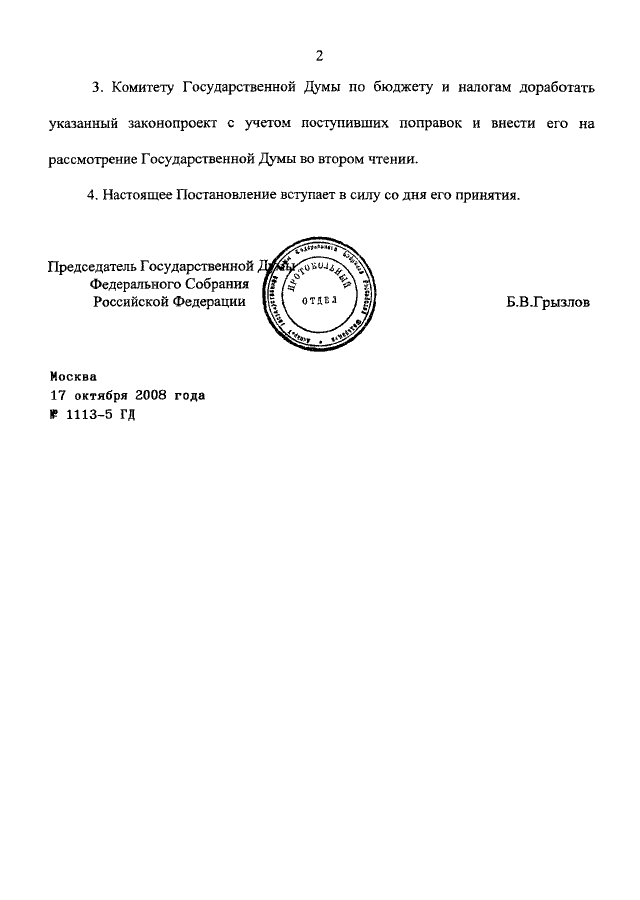 ПОСТАНОВЛЕНИЕ ГД ФС РФ от 17.10.2008 N 1113-5 ГД