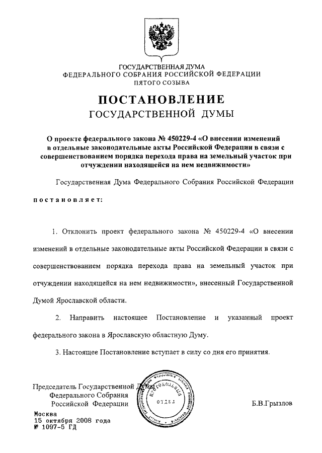 ПОСТАНОВЛЕНИЕ ГД ФС РФ от 15.10.2008 N 1097-5 ГД