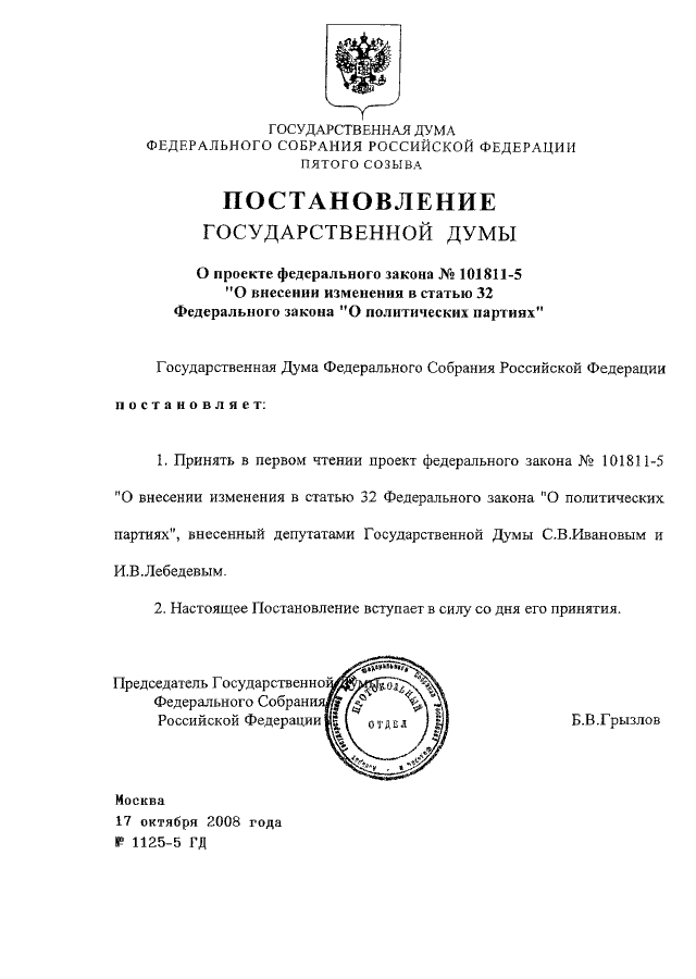ПОСТАНОВЛЕНИЕ ГД ФС РФ от 17.10.2008 N 1125-5 ГД