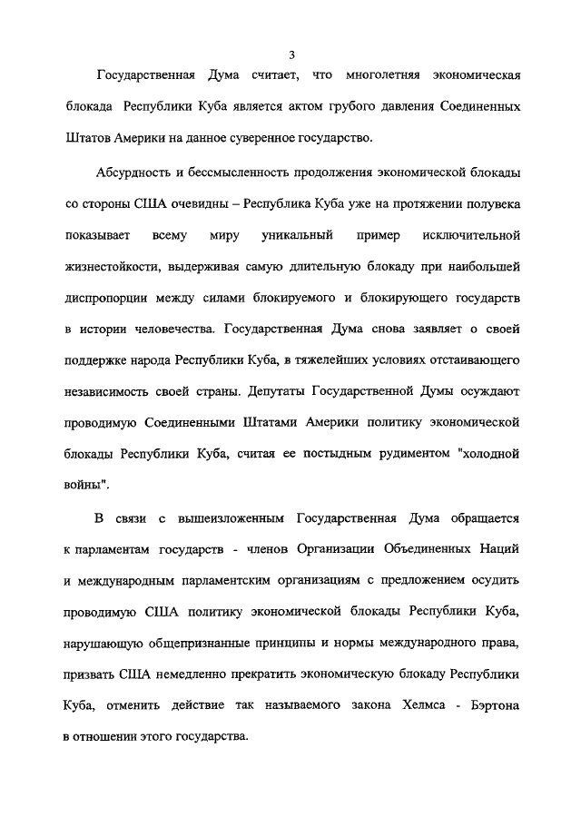 "ОБ ОБРАЩЕНИИ ГОСУДАРСТВЕННОЙ ДУМЫ ФЕДЕРАЛЬНОГО СОБРАНИЯ РОССИЙСКОЙ ФЕДЕРАЦИИ "К ПАРЛАМЕНТАМ ГОСУДАРСТВ - ЧЛЕНОВ ОРГАНИЗАЦИИ ОБЪЕДИНЕННЫХ НАЦИЙ И МЕЖДУНАРОДНЫМ ПАРЛАМЕНТСКИМ ОРГАНИЗАЦИЯМ В СВЯЗИ С НЕОБХОДИМОСТЬЮ ОТМЕНЫ ЭКОНОМИЧЕСКОЙ БЛОКАДЫ РЕСПУБЛИКИ КУБА И ОКАЗАНИЯ ПОМОЩИ РЕСПУБЛИКЕ КУБА В ЛИКВИДАЦИИ РАЗРУШИТЕЛЬНЫХ ПОСЛЕДСТВИЙ СТИХИЙНОГО БЕДСТВИЯ"