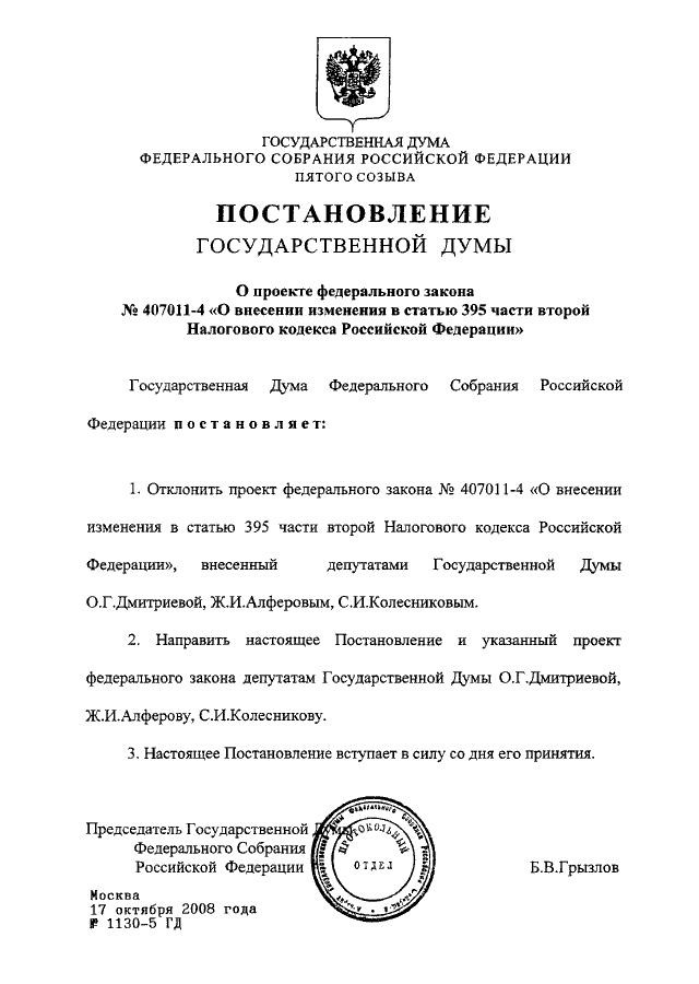 ПОСТАНОВЛЕНИЕ ГД ФС РФ от 17.10.2008 N 1130-5 ГД