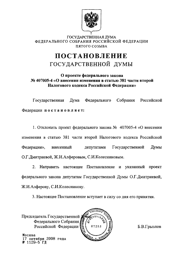 ПОСТАНОВЛЕНИЕ ГД ФС РФ от 17.10.2008 N 1129-5 ГД
