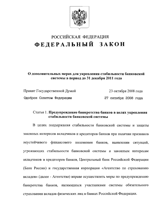 "О ДОПОЛНИТЕЛЬНЫХ МЕРАХ ДЛЯ УКРЕПЛЕНИЯ СТАБИЛЬНОСТИ БАНКОВСКОЙ СИСТЕМЫ В ПЕРИОД ДО 31 ДЕКАБРЯ 2011 ГОДА"