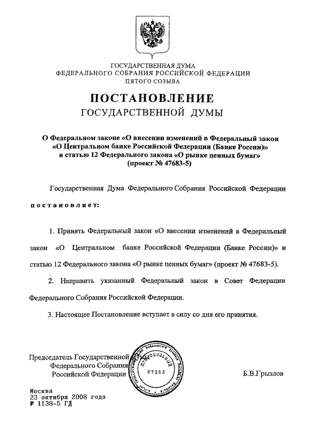 ПОСТАНОВЛЕНИЕ ГД ФС РФ от 23.10.2008 N 1138-5 ГД