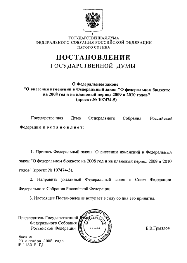 ПОСТАНОВЛЕНИЕ ГД ФС РФ от 23.10.2008 N 1133-5 ГД