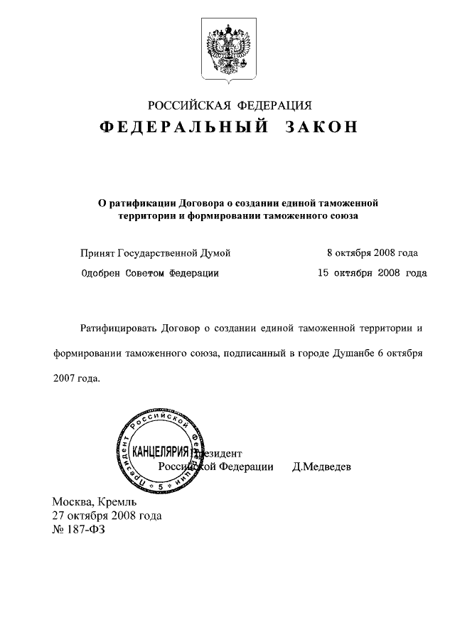 ФЕДЕРАЛЬНЫЙ ЗАКОН от 27.10.2008 N 187-ФЗ