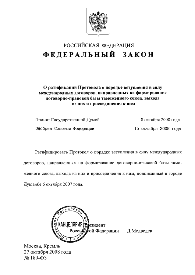 ФЕДЕРАЛЬНЫЙ ЗАКОН от 27.10.2008 N 189-ФЗ