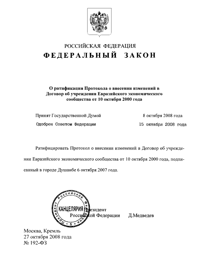 ФЕДЕРАЛЬНЫЙ ЗАКОН от 27.10.2008 N 192-ФЗ