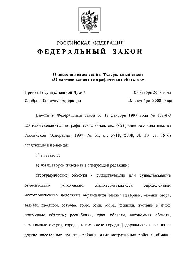 "О ВНЕСЕНИИ ИЗМЕНЕНИЙ В ФЕДЕРАЛЬНЫЙ ЗАКОН "О НАИМЕНОВАНИЯХ ГЕОГРАФИЧЕСКИХ ОБЪЕКТОВ"