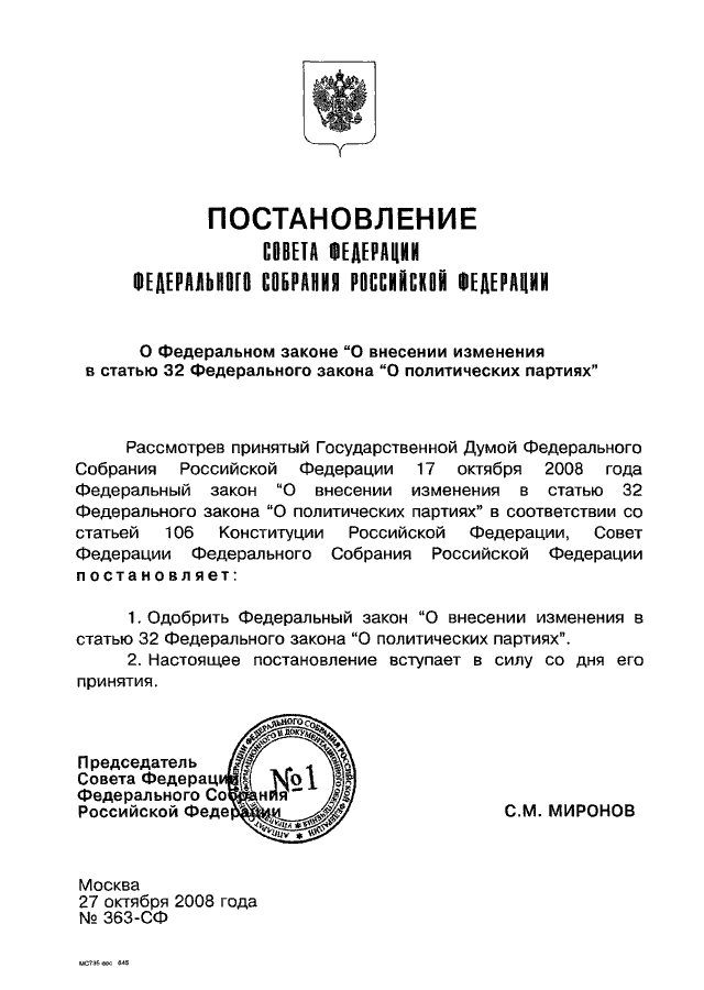 ПОСТАНОВЛЕНИЕ СФ ФС РФ от 27.10.2008 N 363-СФ