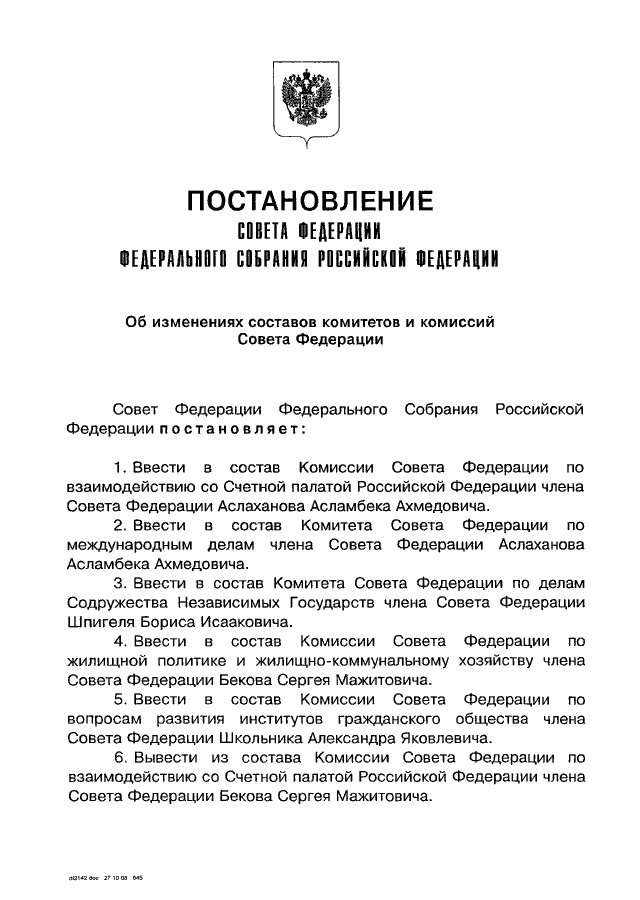 "ОБ ИЗМЕНЕНИЯХ СОСТАВОВ КОМИТЕТОВ И КОМИССИЙ СОВЕТА ФЕДЕРАЦИИ"