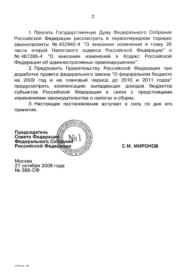 ПОСТАНОВЛЕНИЕ СФ ФС РФ от 27.10.2008 N 366-СФ