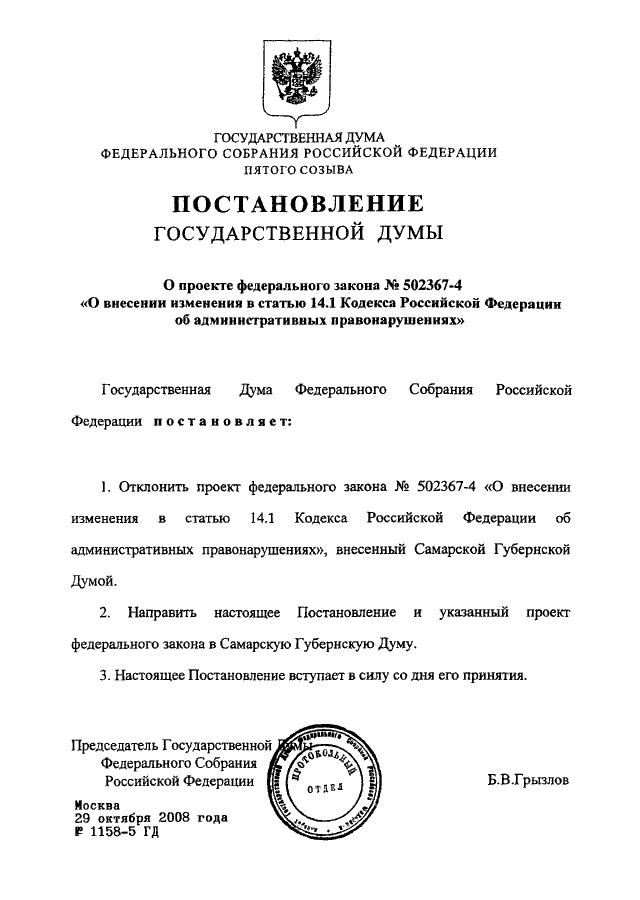 ПОСТАНОВЛЕНИЕ ГД ФС РФ от 29.10.2008 N 1158-5 ГД