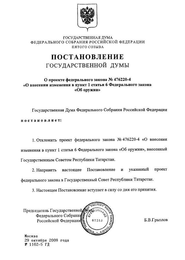 ПОСТАНОВЛЕНИЕ ГД ФС РФ от 29.10.2008 N 1162-5 ГД