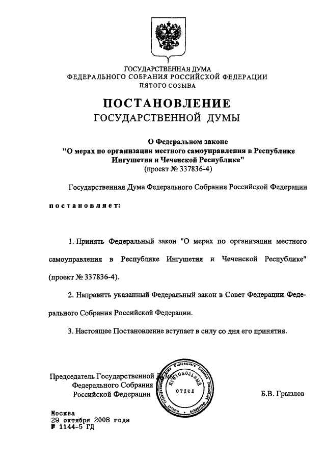 ПОСТАНОВЛЕНИЕ ГД ФС РФ от 29.10.2008 N 1144-5 ГД