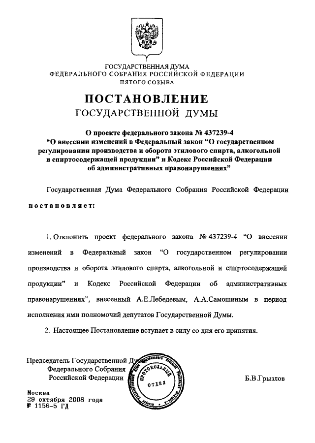 ПОСТАНОВЛЕНИЕ ГД ФС РФ от 29.10.2008 N 1156-5 ГД