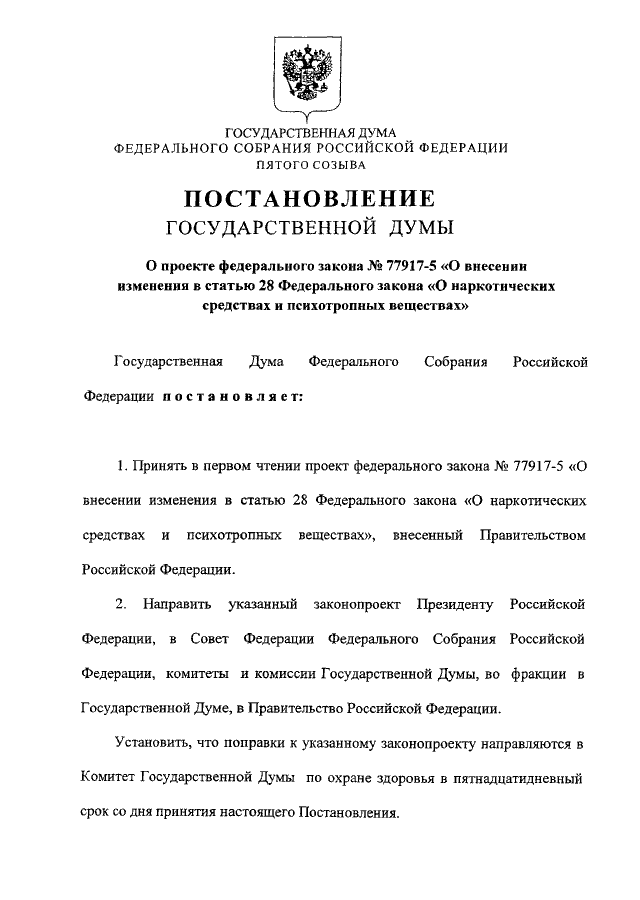 "О ПРОЕКТЕ ФЕДЕРАЛЬНОГО ЗАКОНА N 77917-5 "О ВНЕСЕНИИ ИЗМЕНЕНИЯ В СТАТЬЮ 28 ФЕДЕРАЛЬНОГО ЗАКОНА "О НАРКОТИЧЕСКИХ СРЕДСТВАХ И ПСИХОТРОПНЫХ ВЕЩЕСТВАХ"