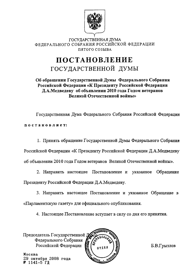 ПОСТАНОВЛЕНИЕ ГД ФС РФ от 29.10.2008 N 1141-5 ГД