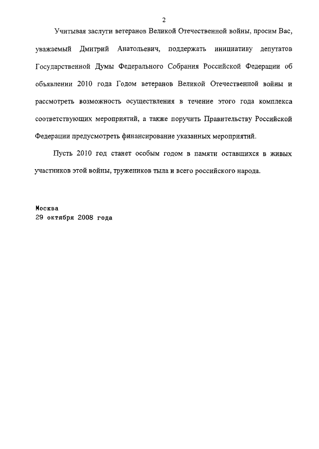 "ОБ ОБРАЩЕНИИ ГОСУДАРСТВЕННОЙ ДУМЫ ФЕДЕРАЛЬНОГО СОБРАНИЯ РОССИЙСКОЙ ФЕДЕРАЦИИ "К ПРЕЗИДЕНТУ РОССИЙСКОЙ ФЕДЕРАЦИИ Д.А. МЕДВЕДЕВУ ОБ ОБЪЯВЛЕНИИ 2010 ГОДА ГОДОМ ВЕТЕРАНОВ ВЕЛИКОЙ ОТЕЧЕСТВЕННОЙ ВОЙНЫ"
