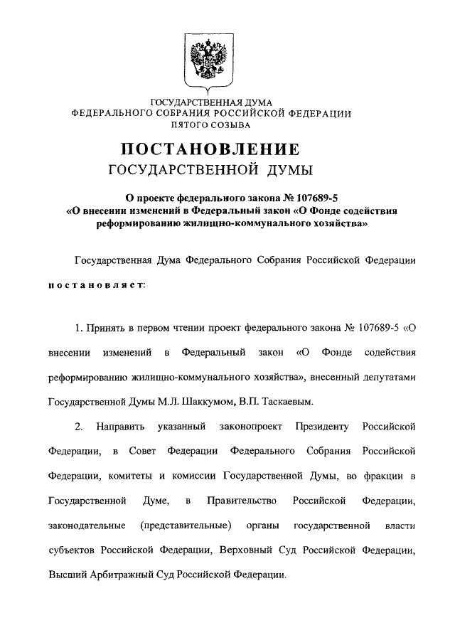 "О ПРОЕКТЕ ФЕДЕРАЛЬНОГО ЗАКОНА N 107689-5 "О ВНЕСЕНИИ ИЗМЕНЕНИЙ В ФЕДЕРАЛЬНЫЙ ЗАКОН "О ФОНДЕ СОДЕЙСТВИЯ РЕФОРМИРОВАНИЮ ЖИЛИЩНО - КОММУНАЛЬНОГО ХОЗЯЙСТВА"